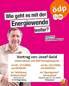 Josef Gold (Unternehmer und ÖDP-Energieexperte) spricht in einem öffentlichen Vortrag über den aktuellen Stand der Energiewende, Herausforderungen und…